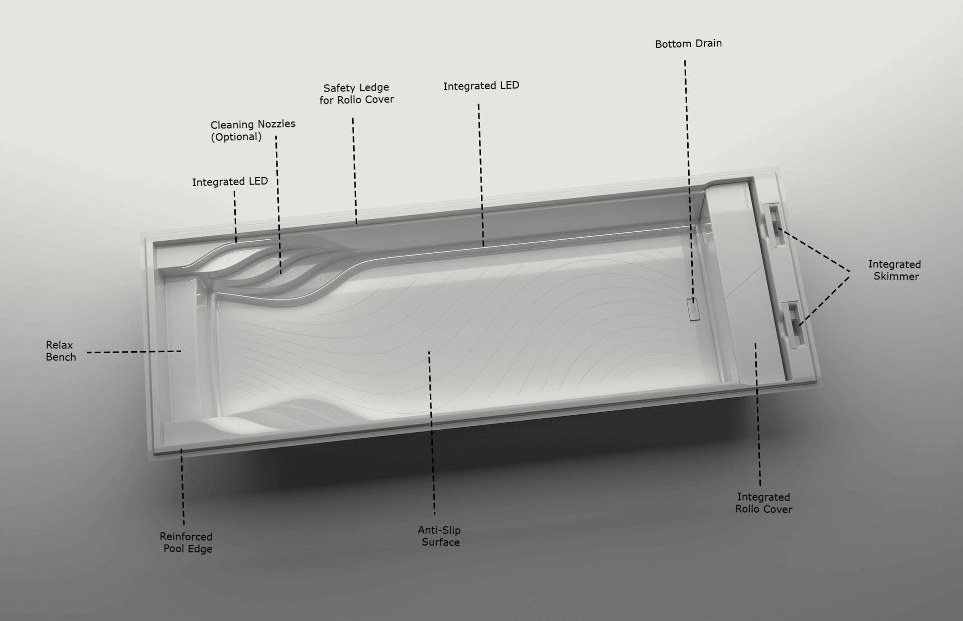 Alles, was wir über die Jahre gesammelt haben, steckt in unserer neuen Poolserie. Unsere Pools - als einzige ihrer Art - vereinen integrierte lineare LED-Beleuchtung, fortschrittliche Funktionen dank Graphen-Nano-Technologie in der Materialstruktur und das beste Gelcoat auf dem Markt, das 99,5% Schutz vor Ausbleichen garantiert.