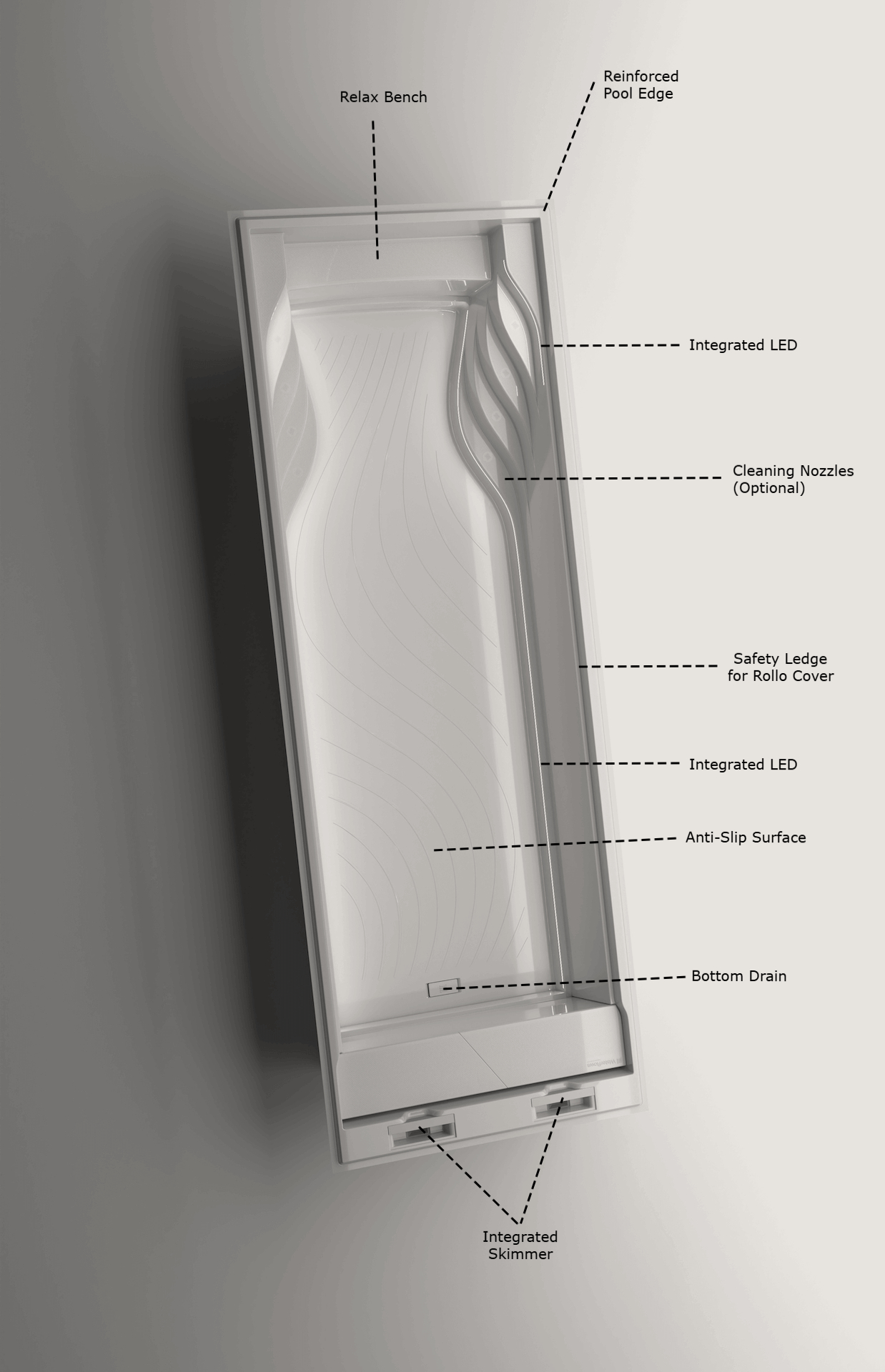 Die Integration der LED-Leiste als Beleuchtung in den Beckenkörper ist eine bahnbrechende Innovation und ein Beitrag zur Herstellung von Verbundbecken. Der LED-Streifen in unseren Pools hat eine maximale IP-Schutzart von „IP68“ und ist mit einem speziellen wasser- und chemikalienbeständigen Silikon ummantelt. Sie ist vollständig austauschbar.